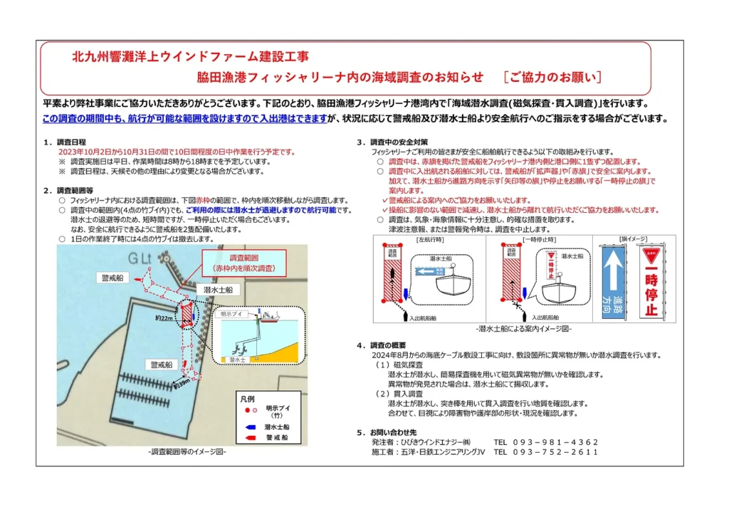 表題の通り、令和5年10⽉2⽇から10⽉31⽇の間で10⽇間程度(平⽇、作業時間は8時から18時)、脇⽥漁港フィッシャリーナ港湾内で「海域潜⽔調査(磁気探査・貫⼊調査)」を⾏うそうです。調査期間中、添付の資料のように航⾏が可能な範囲を設け、⼊出港はできますが、状況に応じて警戒船及び潜⽔⼠船より安全航⾏への指⽰をする場合があるようです。ご理解とご協力をお願いします。