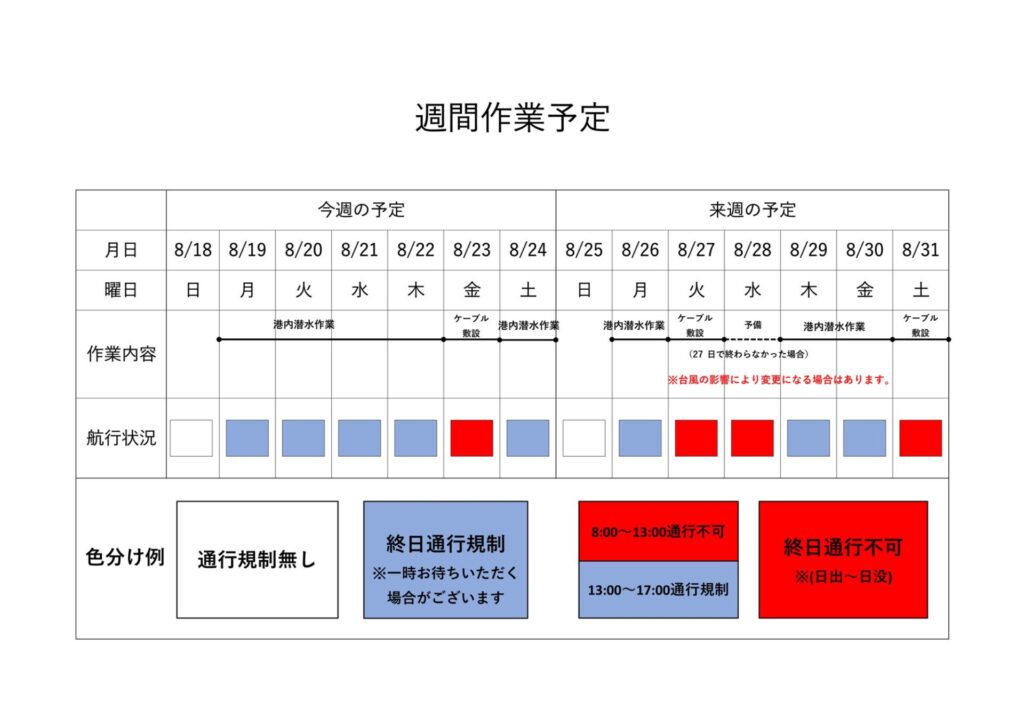 本日23日、無事に港内のケーブル敷設の1本目(全4本中)が完了したそうです。したがって、予備日としていた明日8月24日(土)は、航行可能となるそうです。また、来週は台風の影響で予定変更の可能性があります。