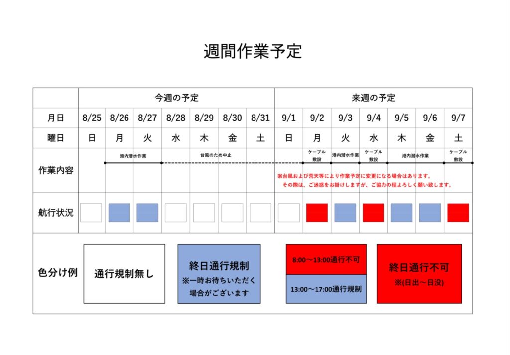 工事の週予定表です。出入港前に必ずチェックをお願いします。台風10号の影響で工事予定にも変更が生じていますが、ご協力のほどよろしくお願いします。※長期の予定を知りたい方は、6月7日港内工事情報の工期全体予定表をご覧ください。 港内工事情報 8月26日港内工事情報(臨時変更) 第6回WFC釣り大会のご案内
