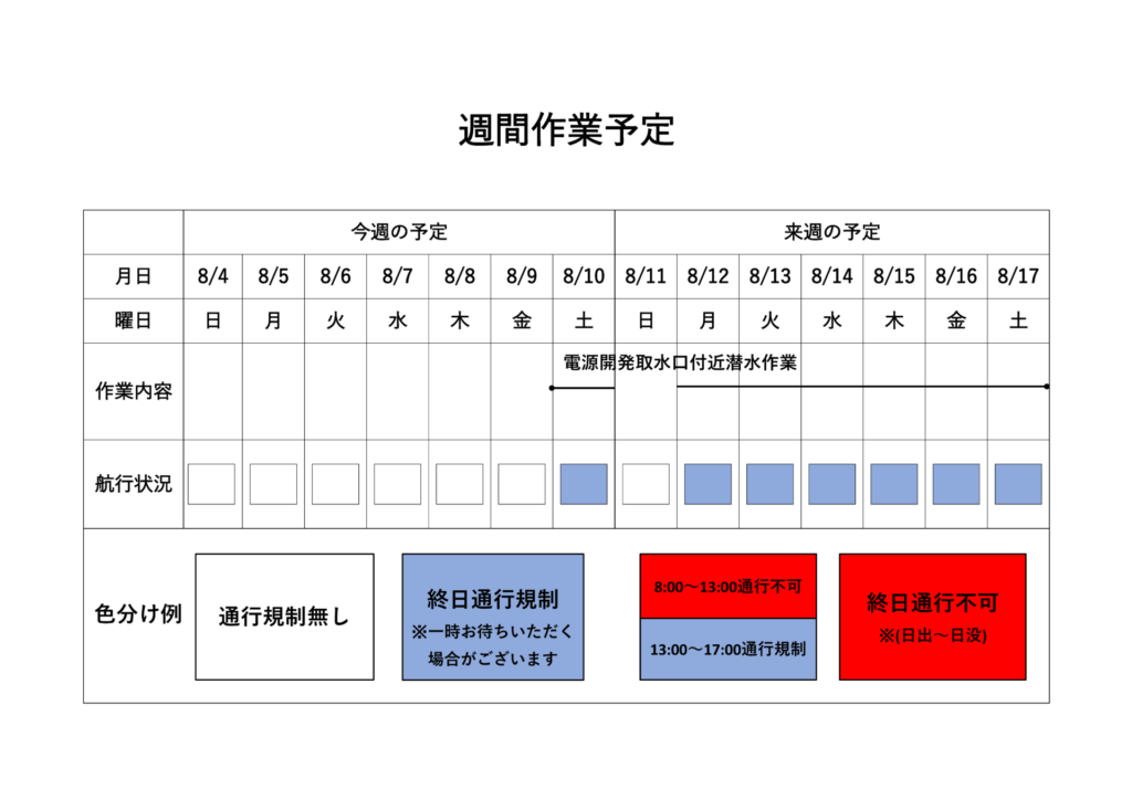 工事の週予定表です。出入港前に必ずチェックをお願いします。