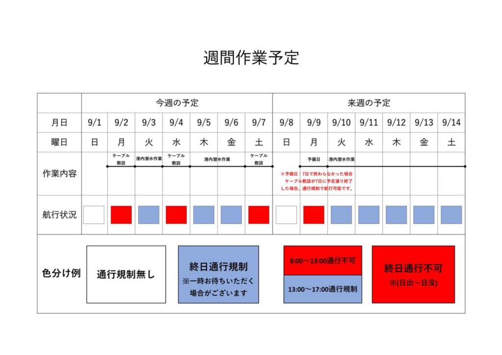 工事の週予定表です。出入港前に必ずチェックをお願いします。※長期の予定を知りたい方は、6月7日港内工事情報の工期全体予定表をご覧ください。 港内工事情報 第6回WFC釣り大会のご案内 9月13日港内工事情報